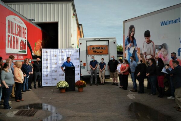 Caption: Walmart, Bimbo Bakeries USA and Tyson Foods teamed up to donate 15,000 pounds of food – equating to 12,500 meals – to the New Hampshire Food Bank through a partnership with Feeding America. Pictured here, Eileen Liponis, Executive Director of the New Hampshire Food Bank, addresses the crowd during an event today, September 16, celebrating the donation.