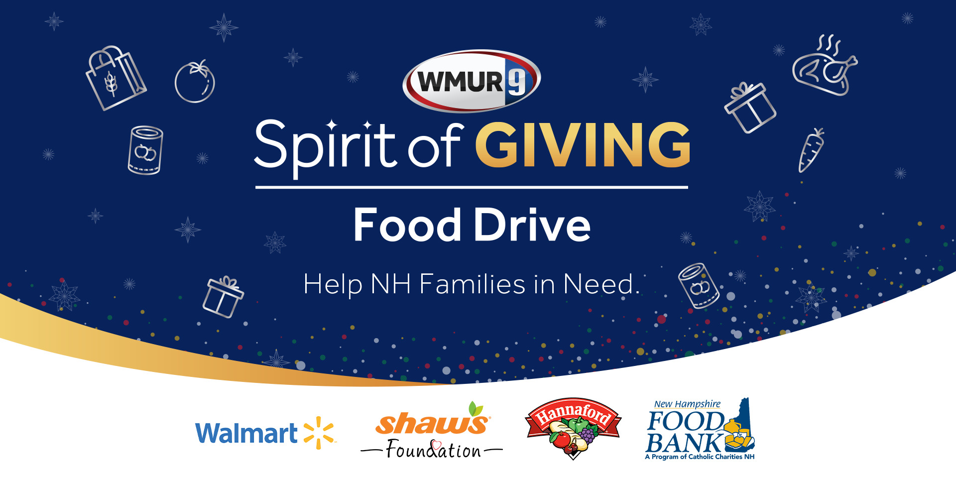 WMUR’s 2024 Spirit of Giving Food Drive benefiting the NH Food Bank is being held December 13, 14, 15, at Hannaford, Shaw’s and Walmart stores statewide.